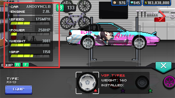 4、查看赛车的性能面板,了解当前速度、动力等参数,同时确认已安装的轮毂部件,完成改装配置。