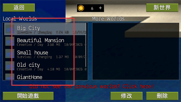 1、点击界面里的開始遊戲按钮,进入世界选择界面,准备开启对应的建造玩法。