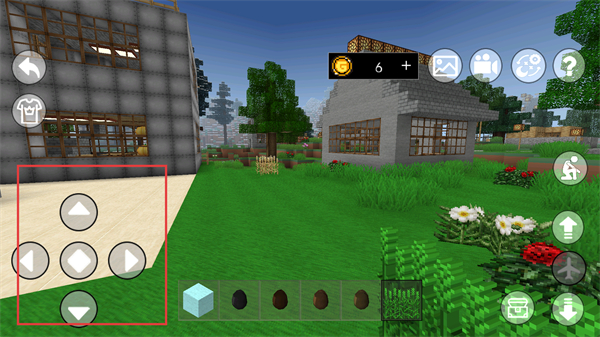 3、在游戏场景中点击方向按钮控制角色移动,选择下方的方块资源,准备进行建造操作。